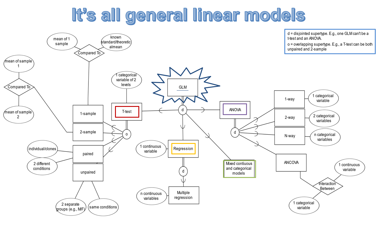 Parametric tests allow you to make predictions from your model (make estimates from coefficient parameters). However, they rely on assumptions not being broken to produce reliable predicted values. The term GLM encompasses a wide range of parametric tests: t-test, ANOVA etc are different methods of fitting linear equations to data in order to model and predict. Click here to see a diagram explaining this! (opens in a new tab)